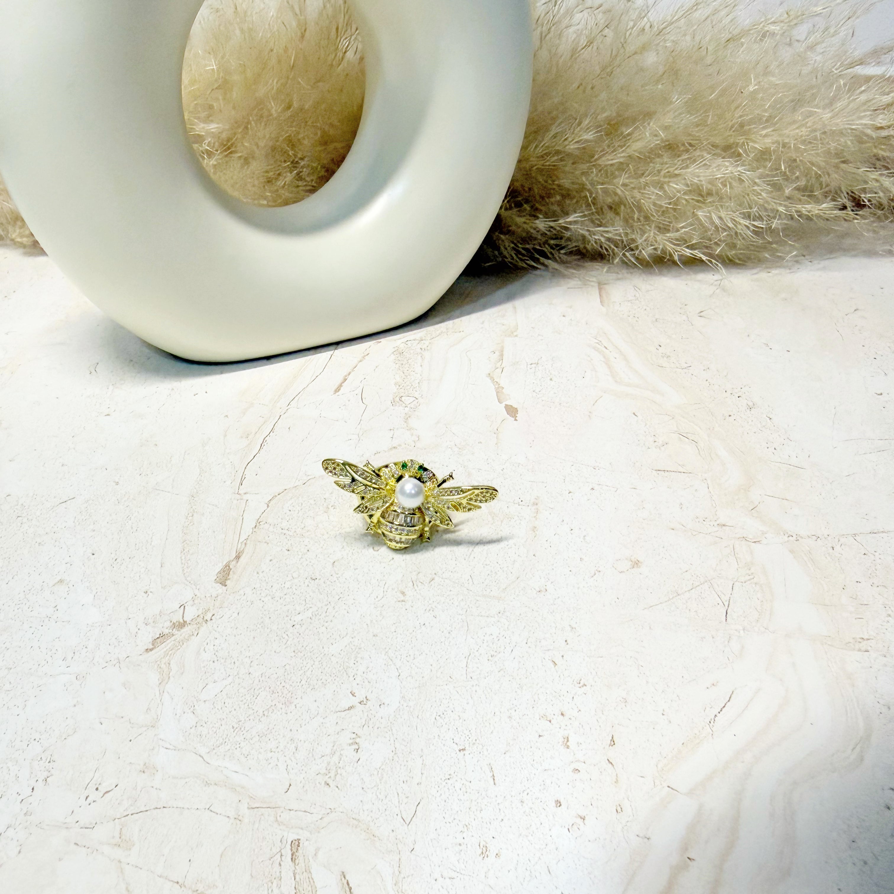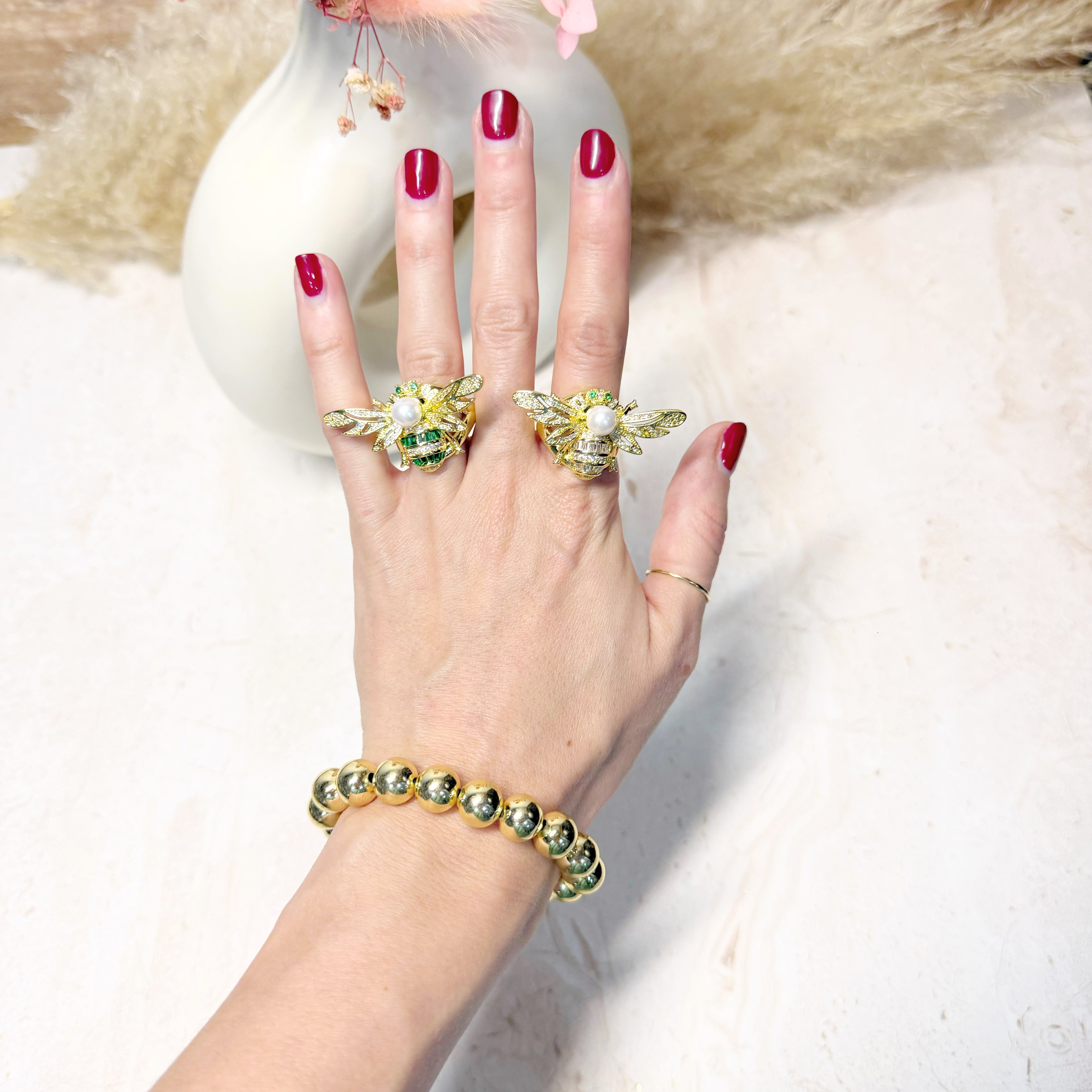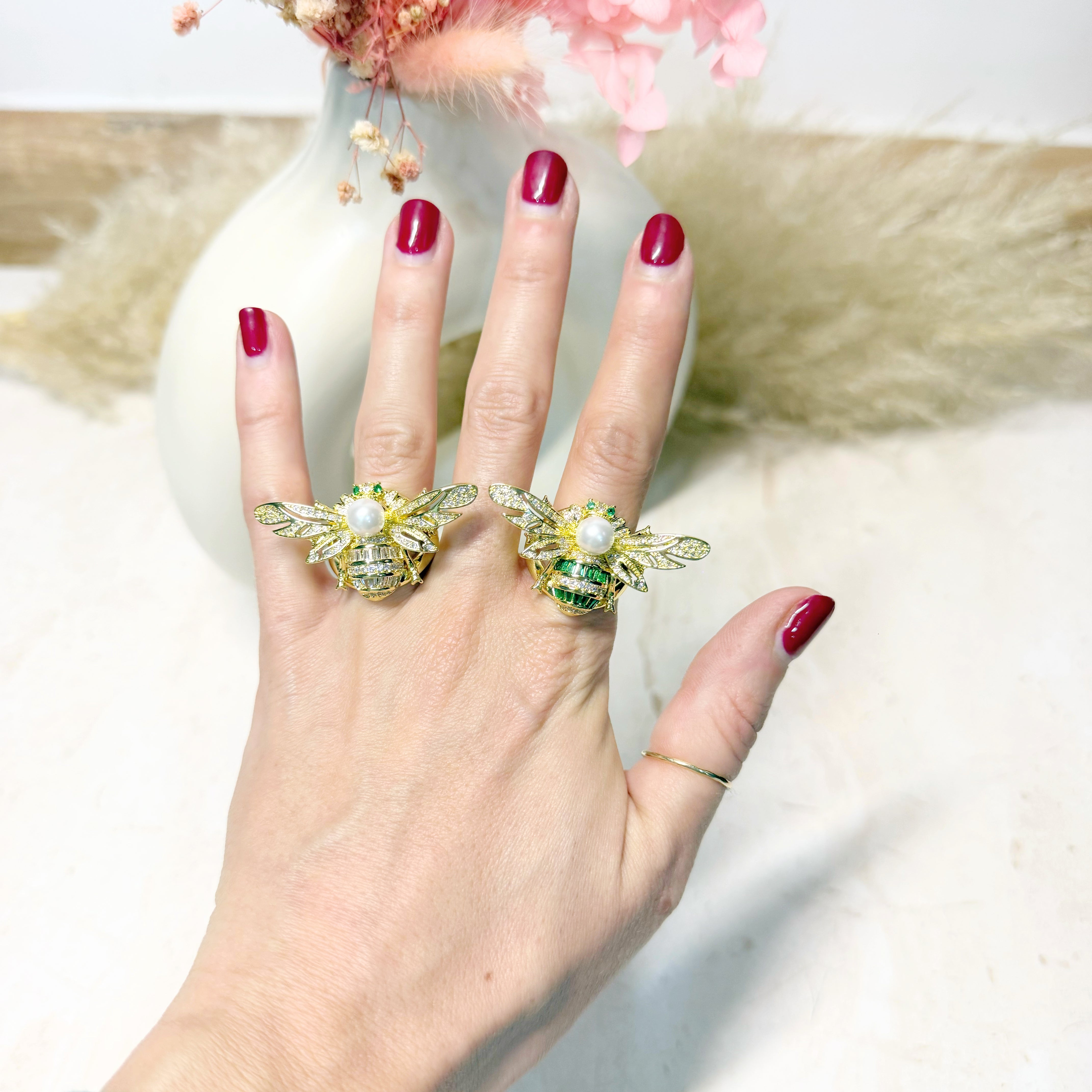 Anillo en forma de avispa con zirconias verdes, blancas.