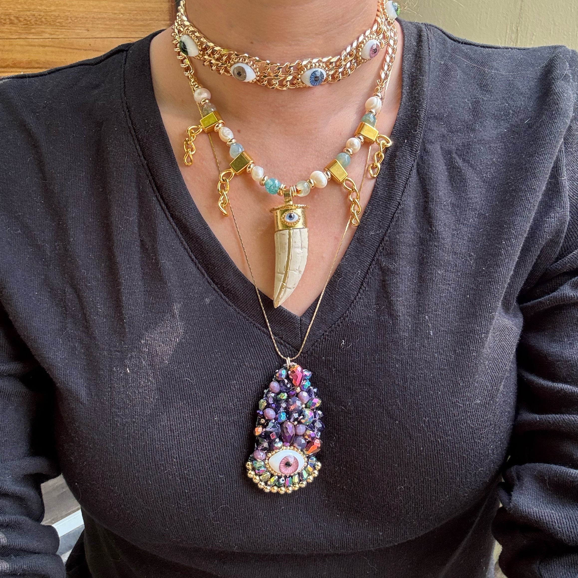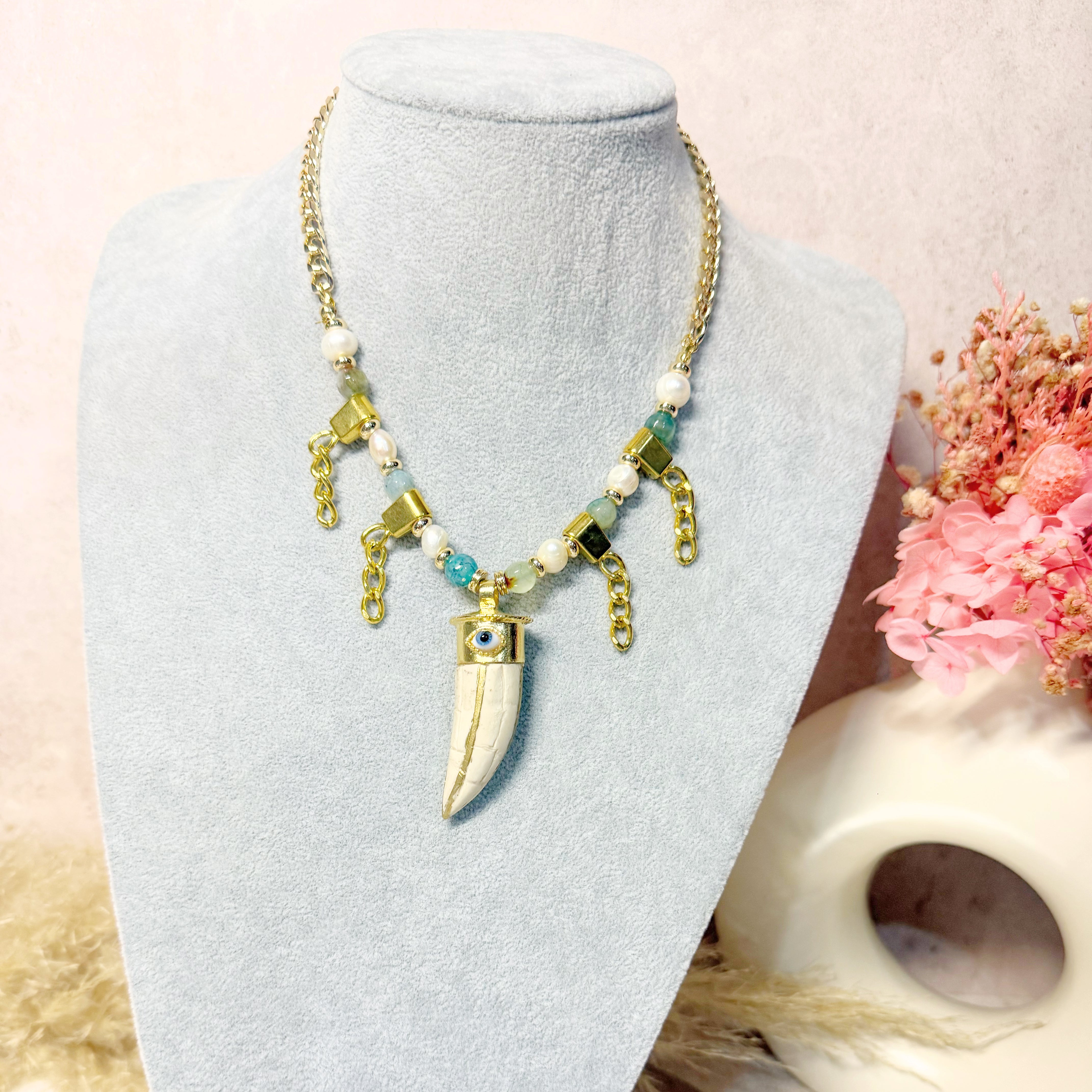 Gargantilla con cadena, piedras naturales, cuerno con ojo, diseño único.