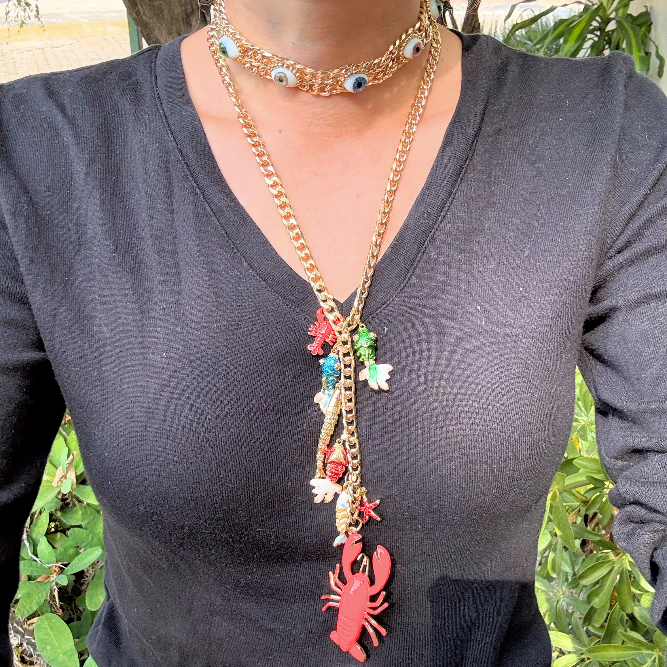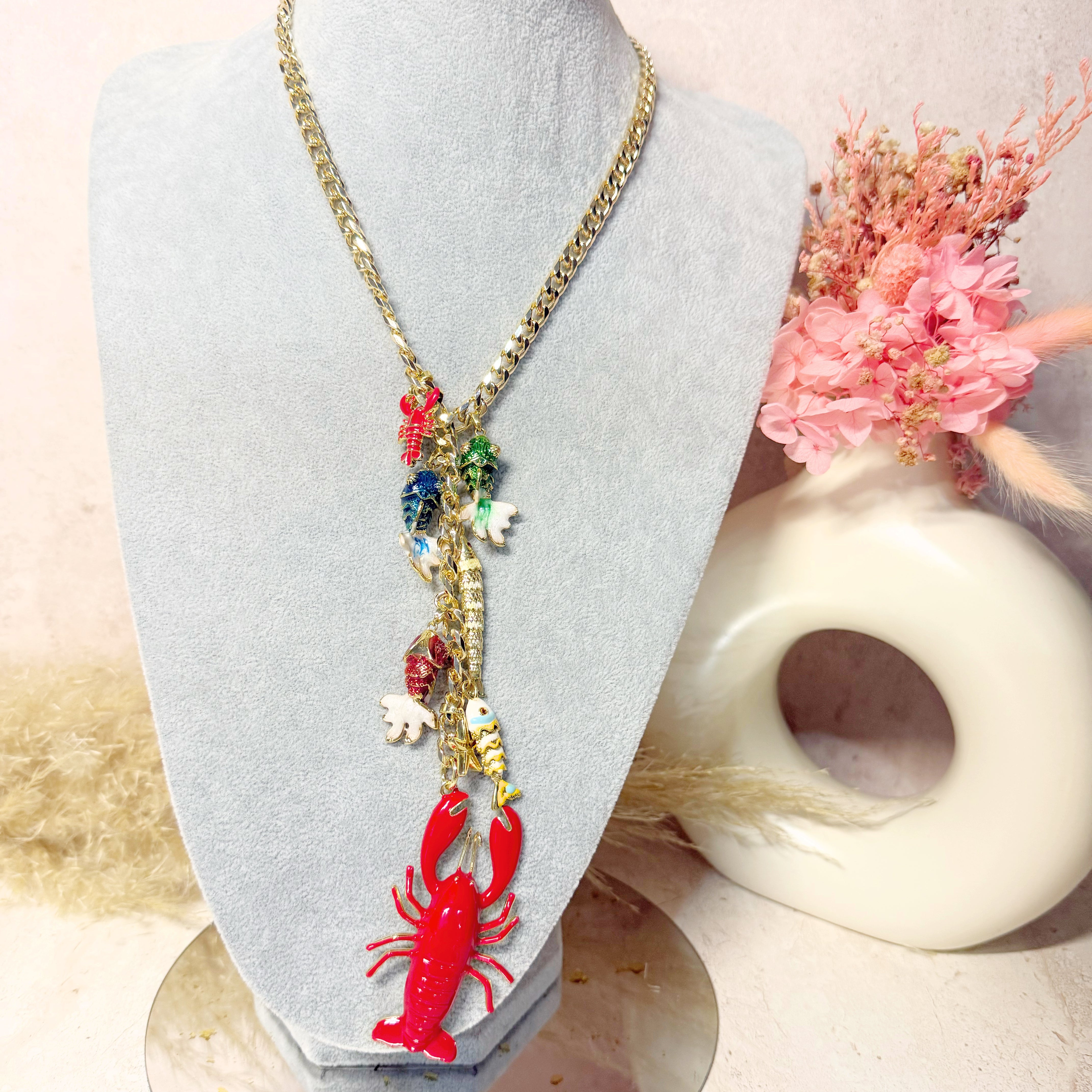 Gargantilla con 7 peces diferentes que representan la abundancia en tu día. Dije grande de cangrejo y chico que representan protección.