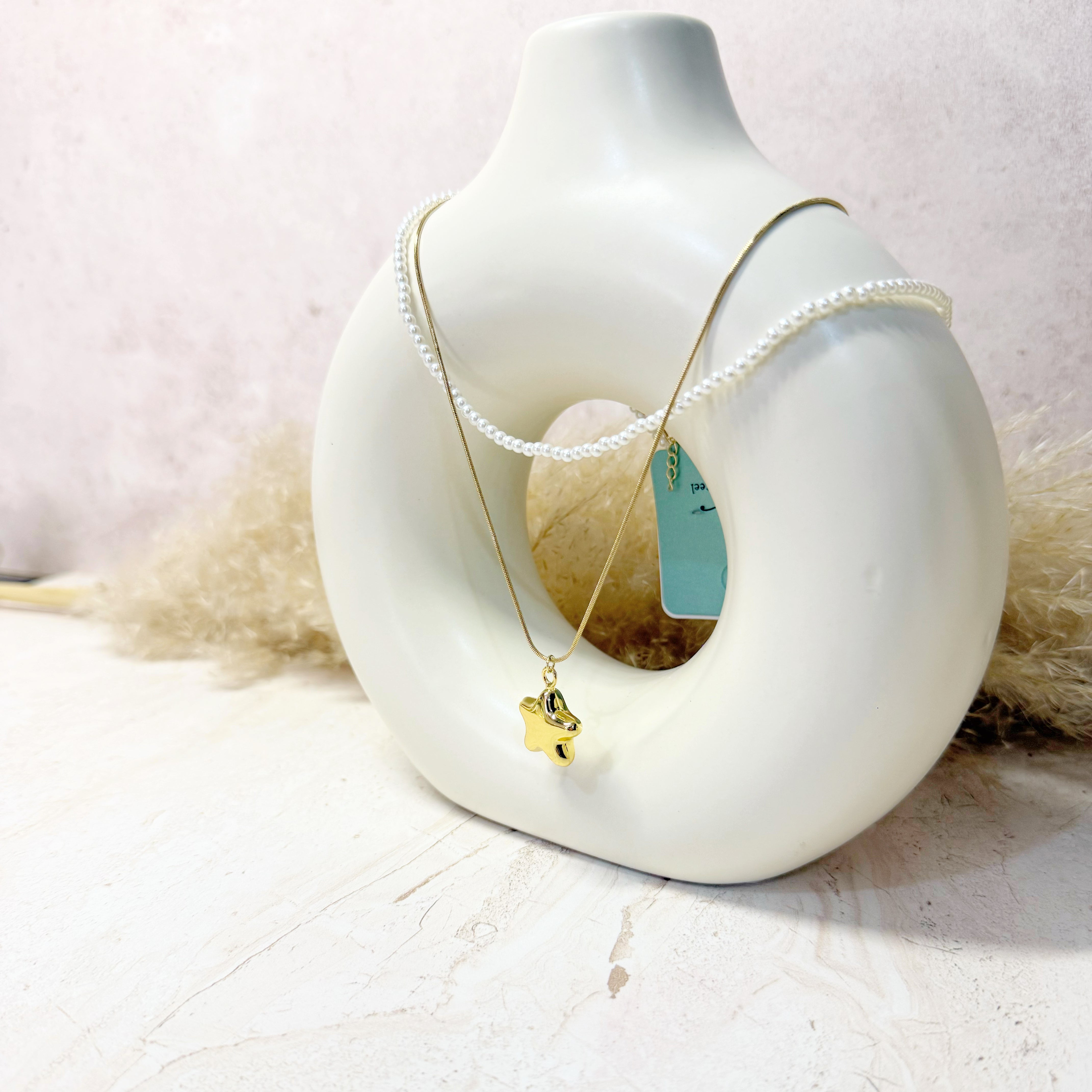 Gargantilla doble de imitación perlitas y cadena tipo cola de rata y dije de estrella inflada.
