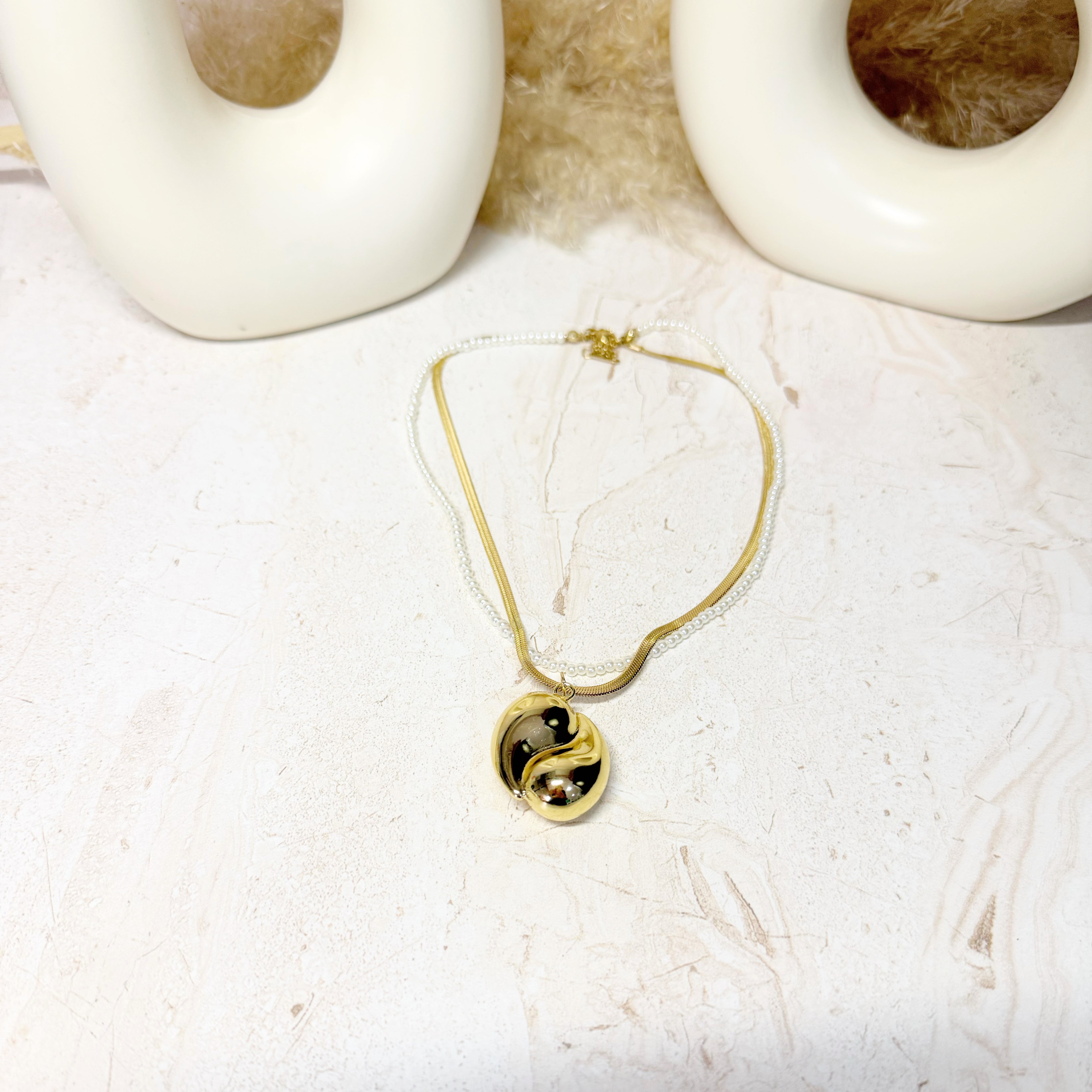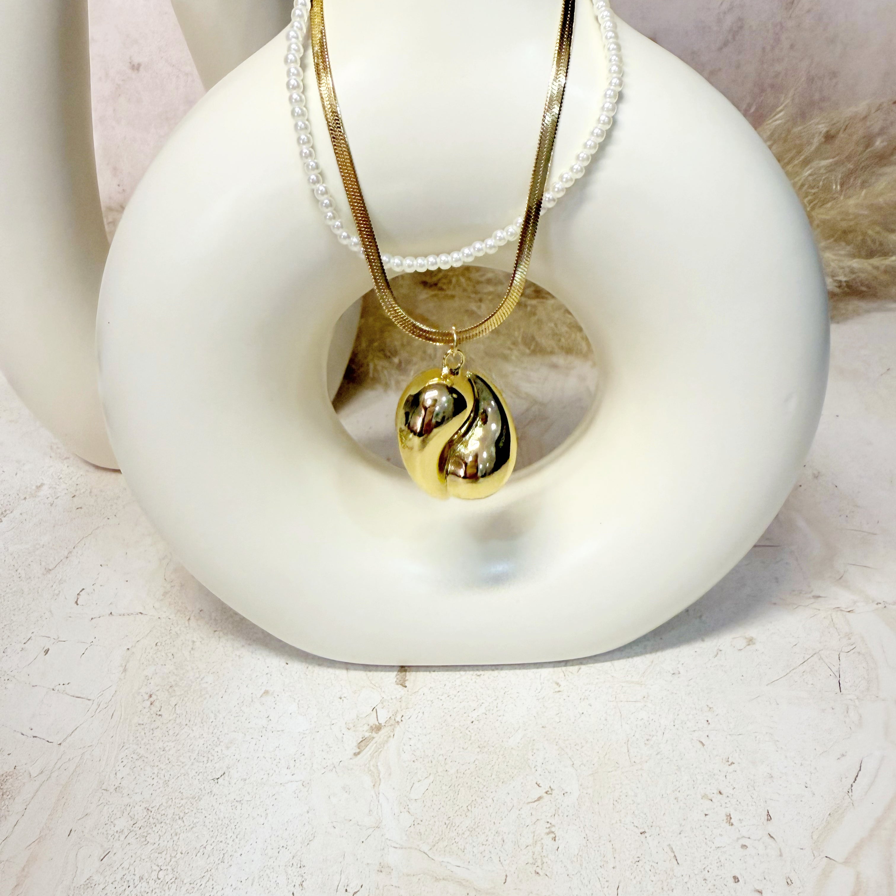 Gargantilla doble imitación perla y cadena planchada con dije inflado.