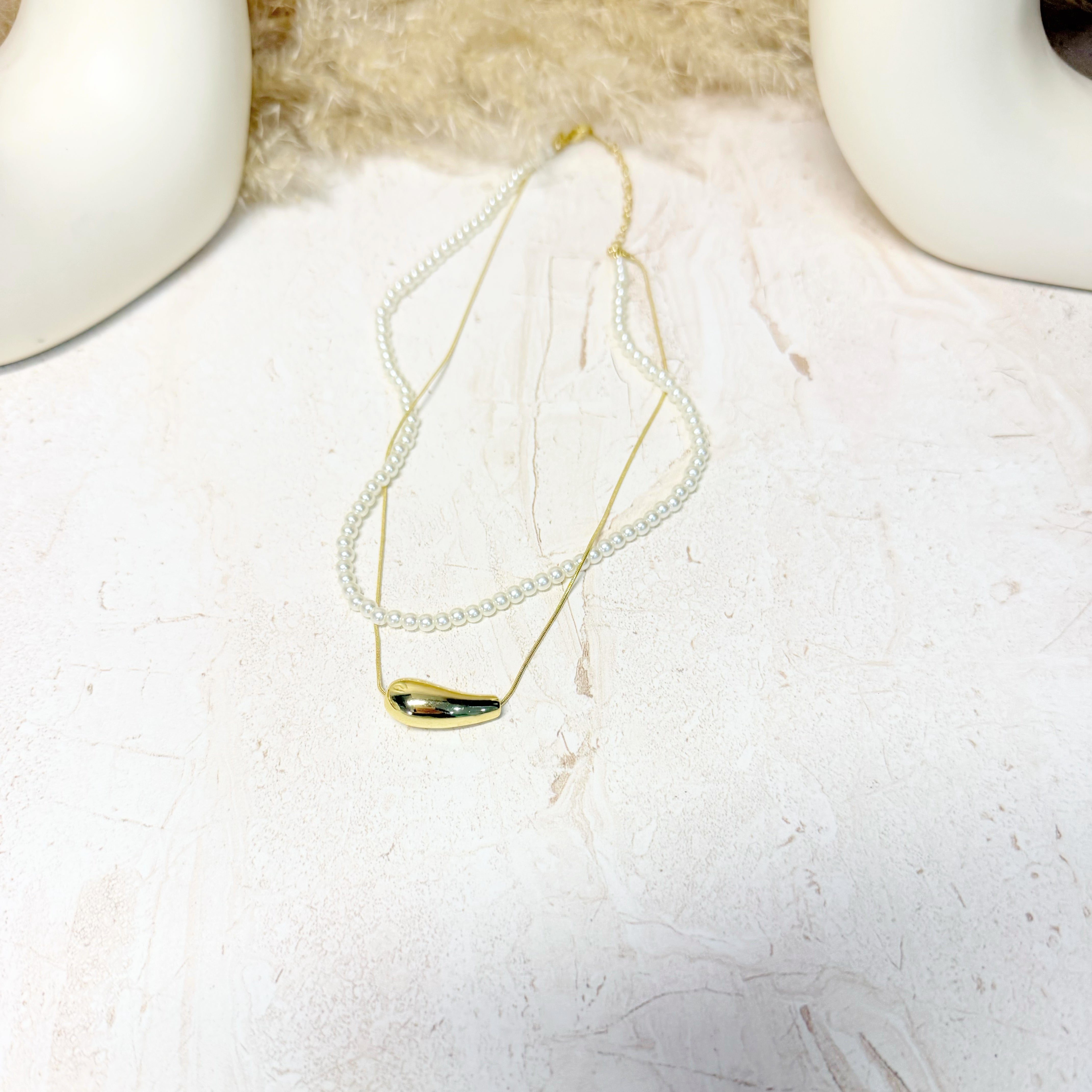 Gargantilla doble imitación de perla y dije de gota de chapa de oro 18k.