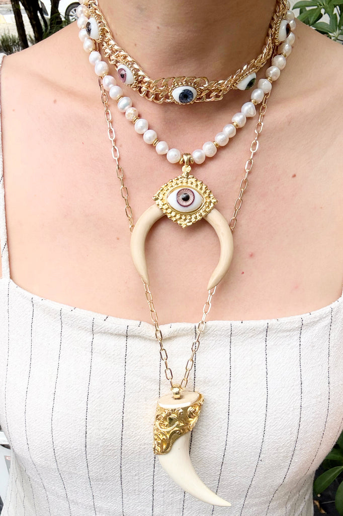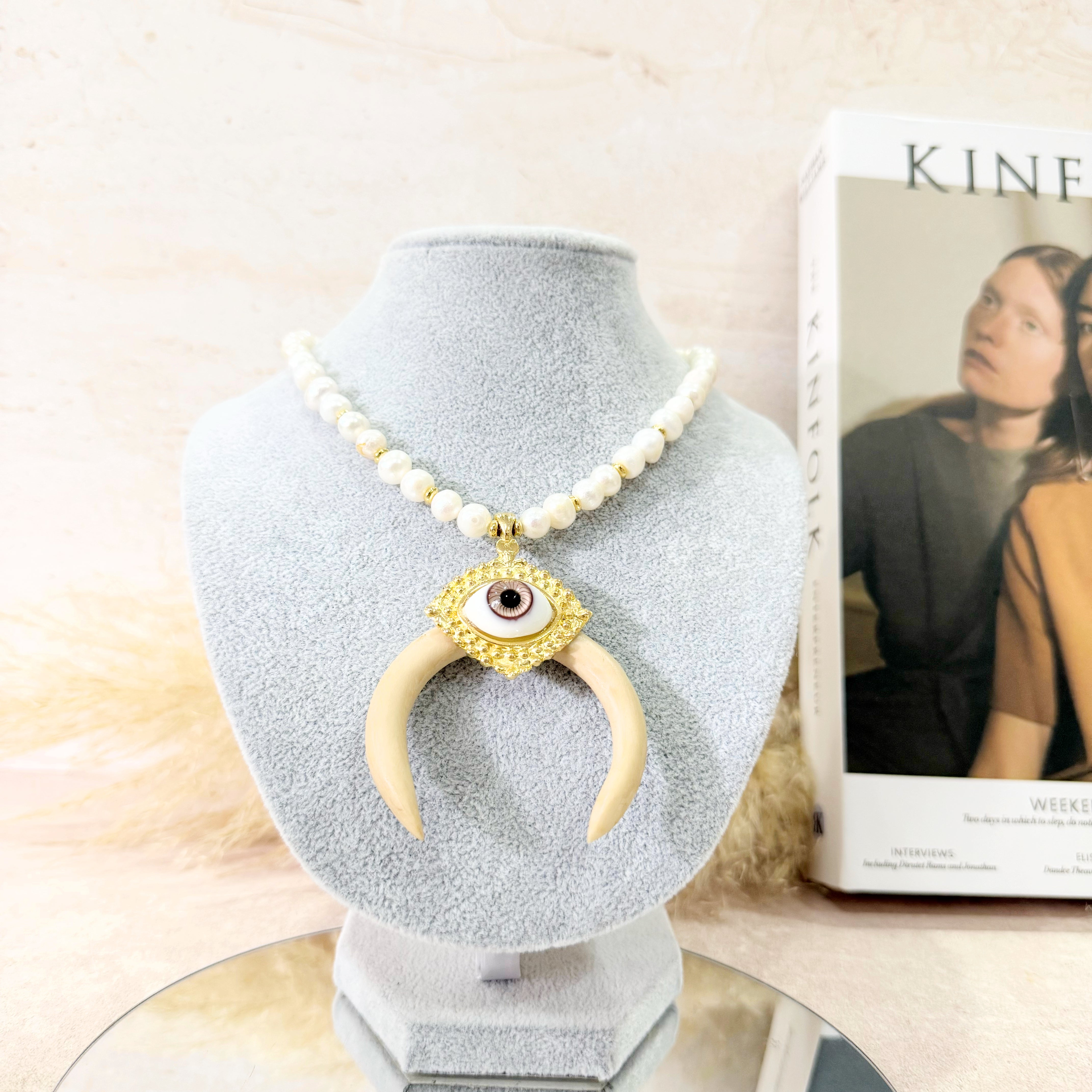 Gargantilla de perlas naturales con dije de cuerno con ojo de vidrio.