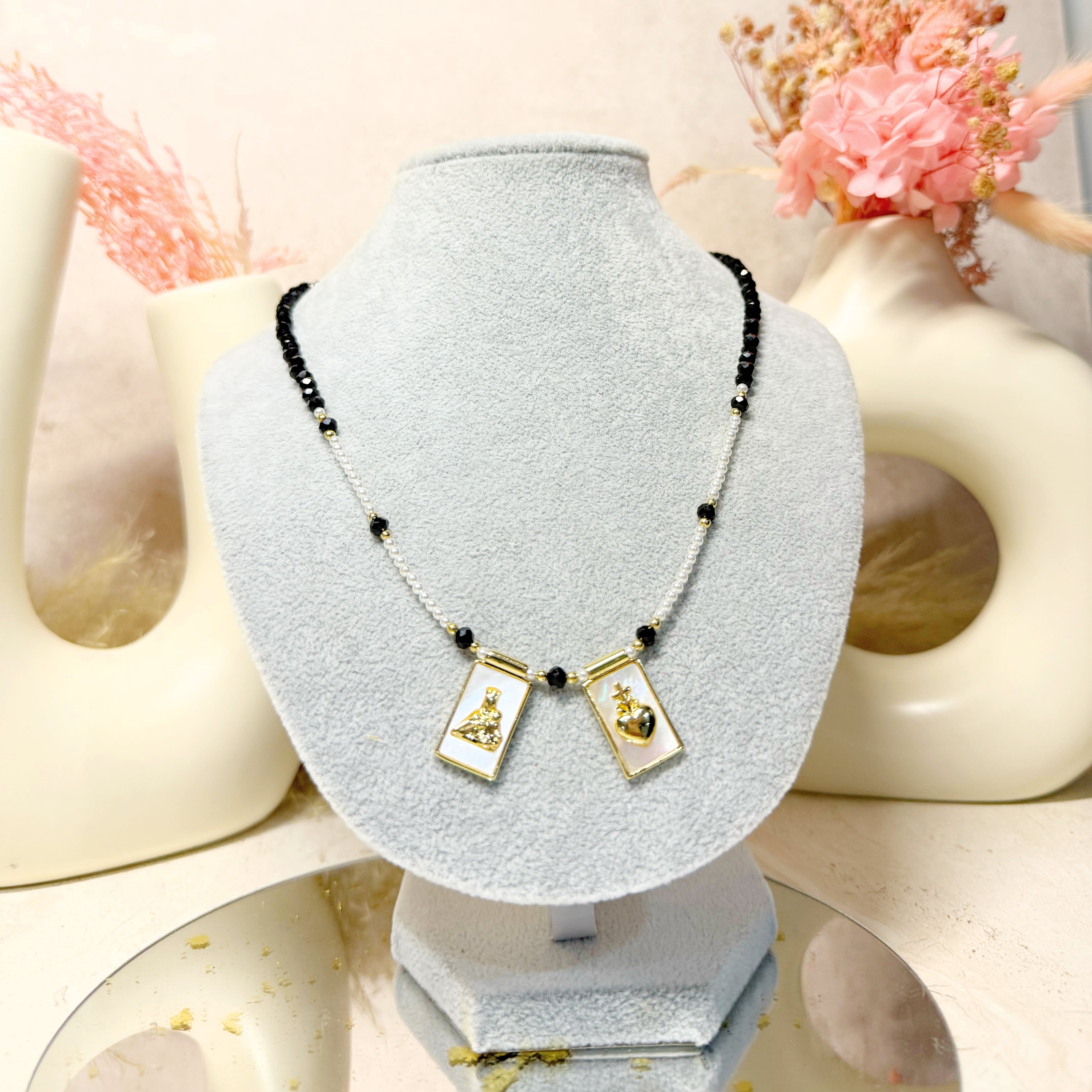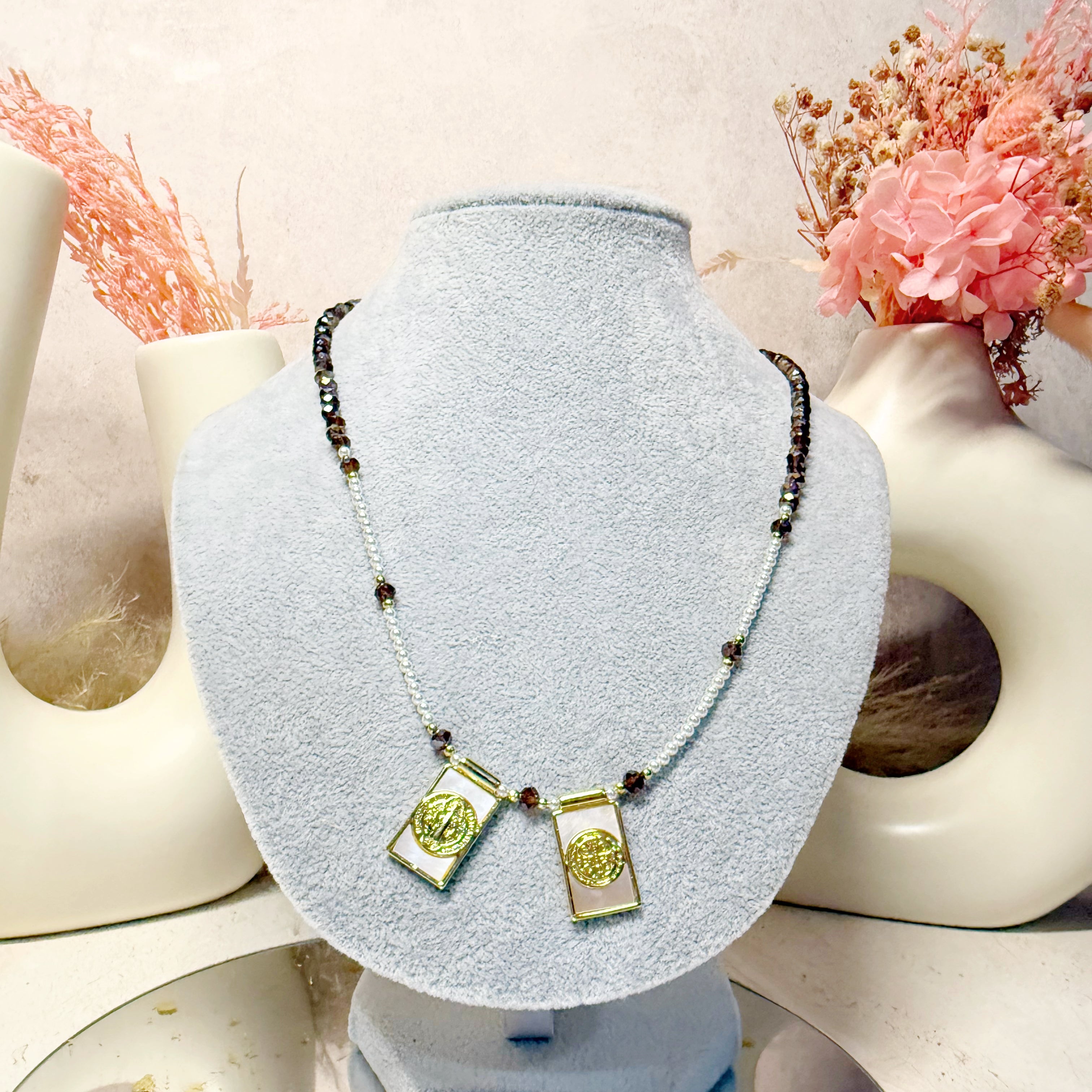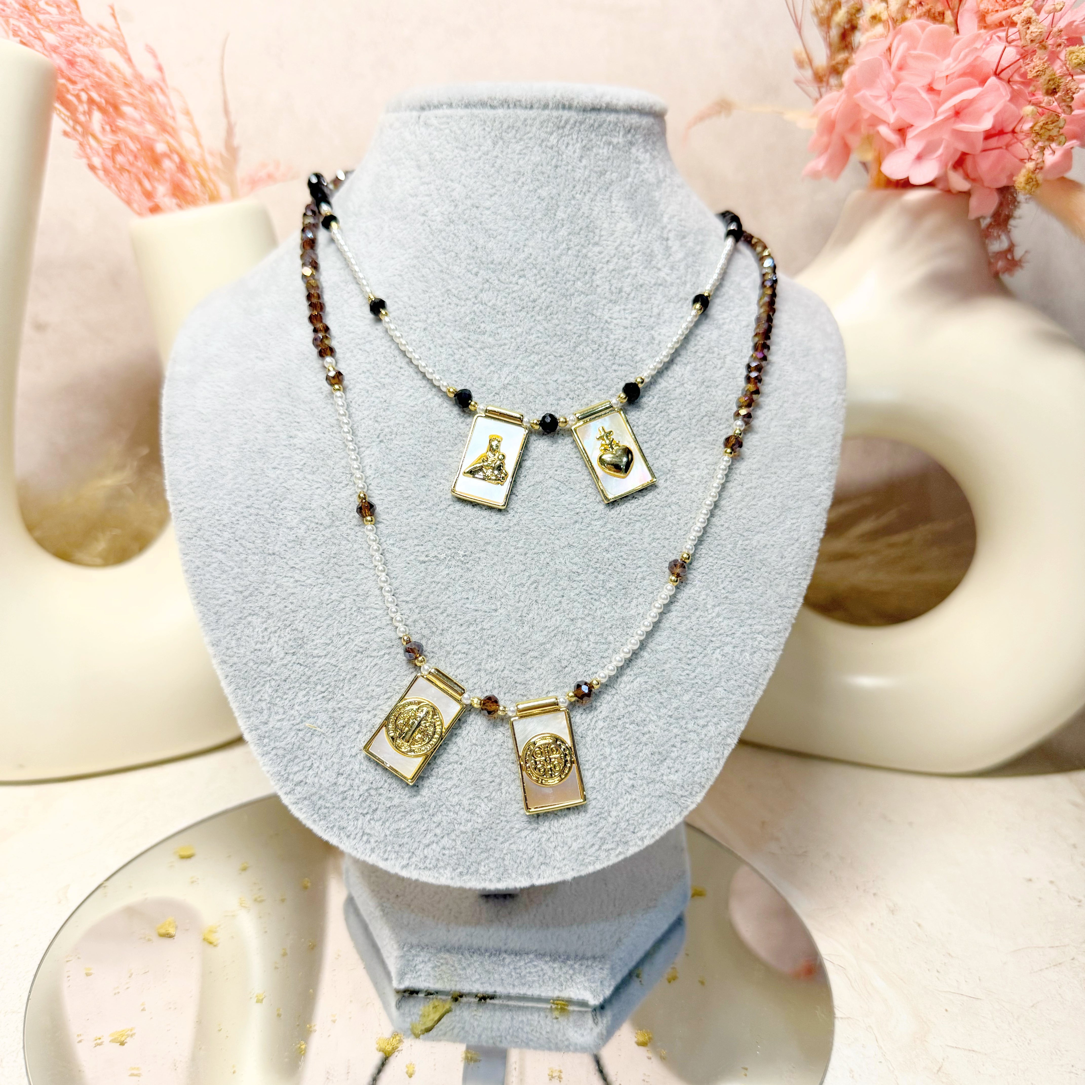 Gargantilla armada con dijes relogiosos de san benito o Virgen del Carmen de chapa de oro 18k.