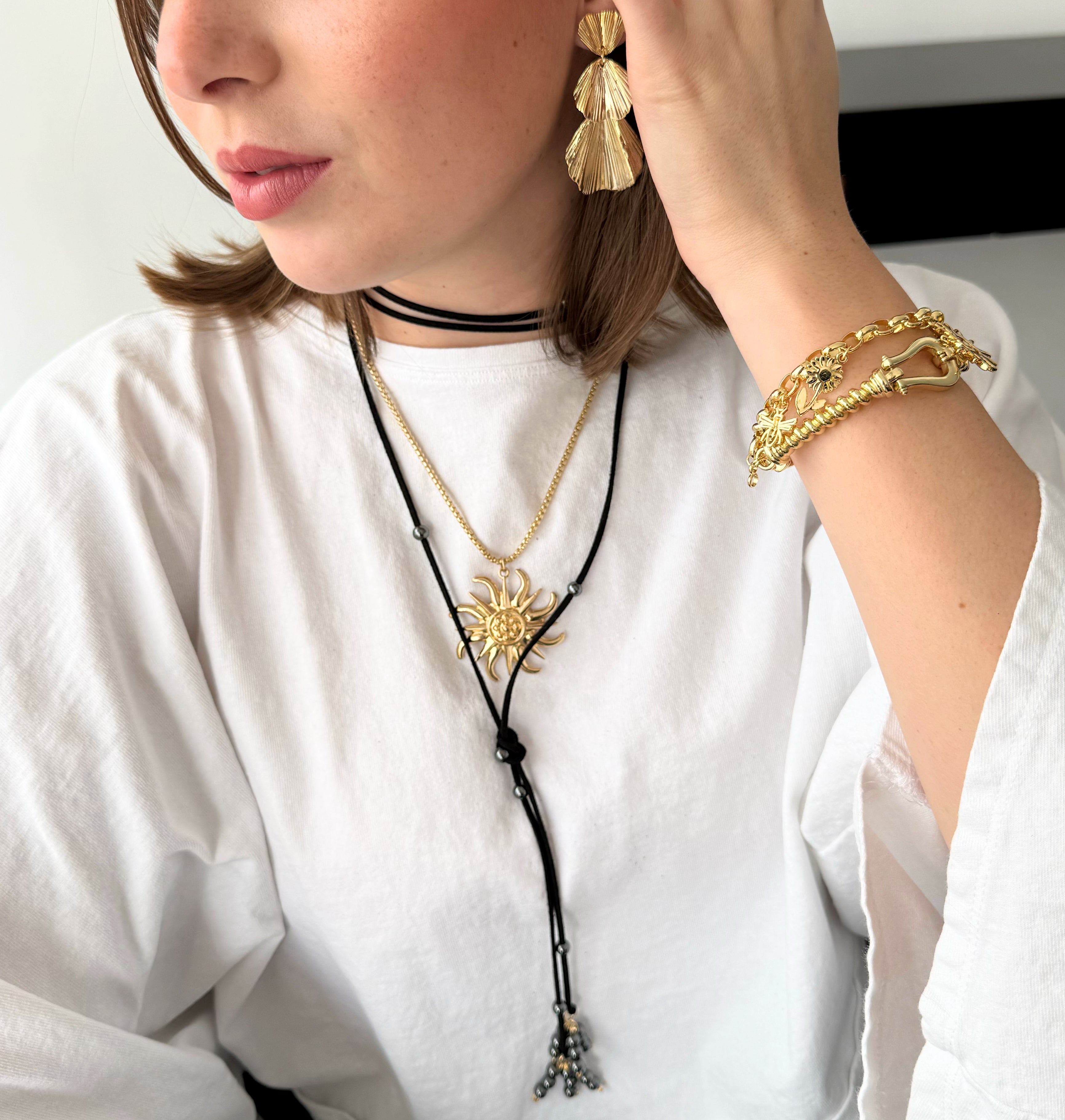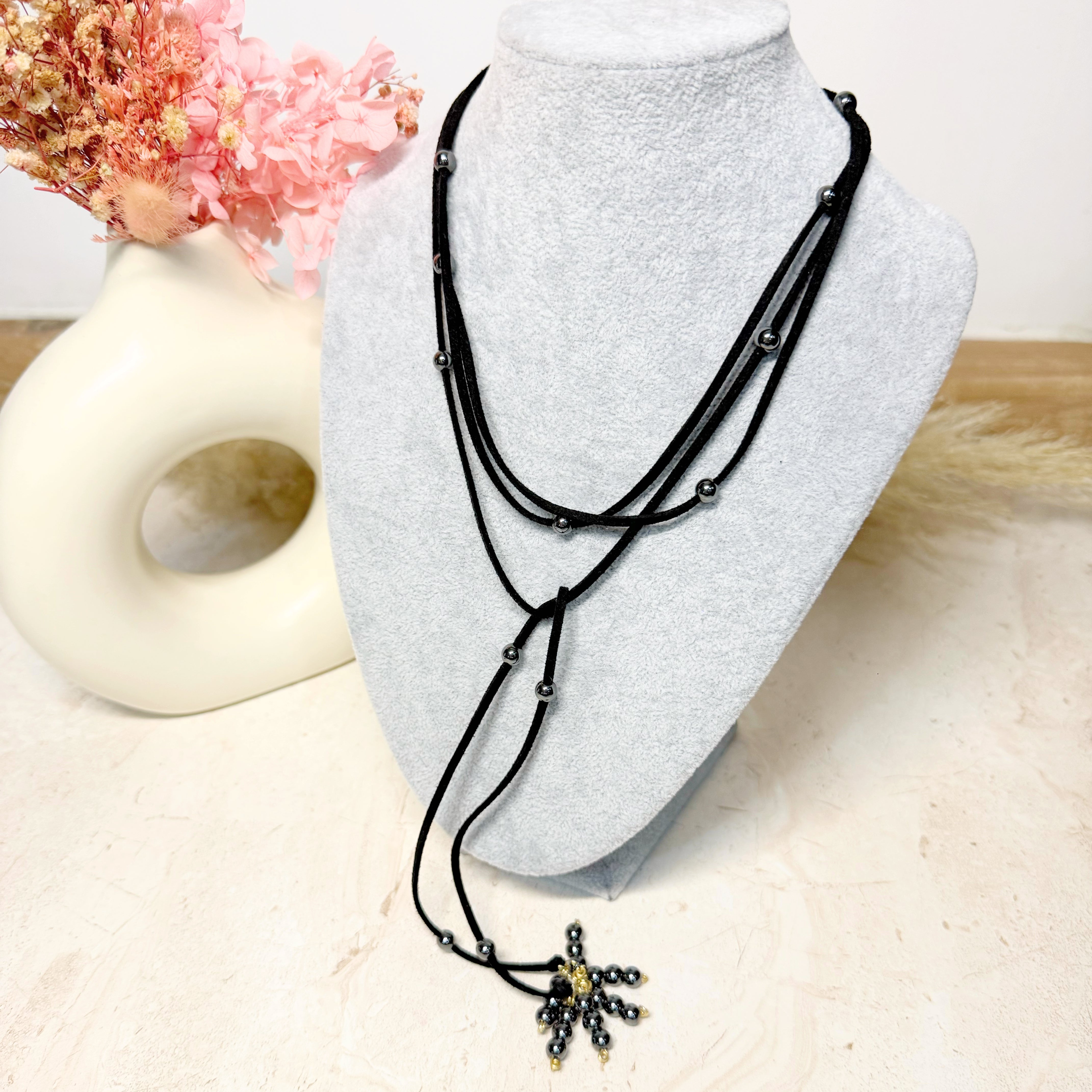 Gargantilla corbatín de gamusa con piedras hematitas.